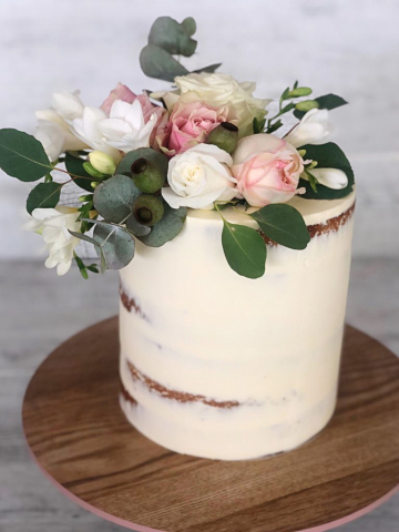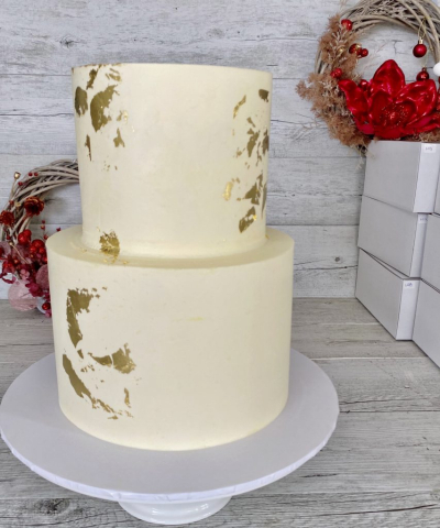 2 tier – Top tier: 6 inches (15cm) round, 5 inches (12cm) tall. Bottom tier: 9 inches (23cm) round, 5 inches (12cm) tall.